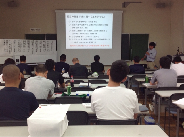 ー平成30年7月15・16日に日伝建後期研修会が八王子大学セミナーハウスに於いて開催しました。 増田兼房先生による日本建築史の講義をうけました。 持田武夫先生により扇垂木の原寸引き付けの指導を受けました。 大野敏先生による古建築修理の講義をうけました。 また、15日に台湾政府・文化部文化資産局日本視察団の方々が、日伝建研修会を視察されました。 視察の合間に研修内容の聴き取り等取材に協力しました。 鳴海祥博先生による伝統大工技術の講義をうけました。