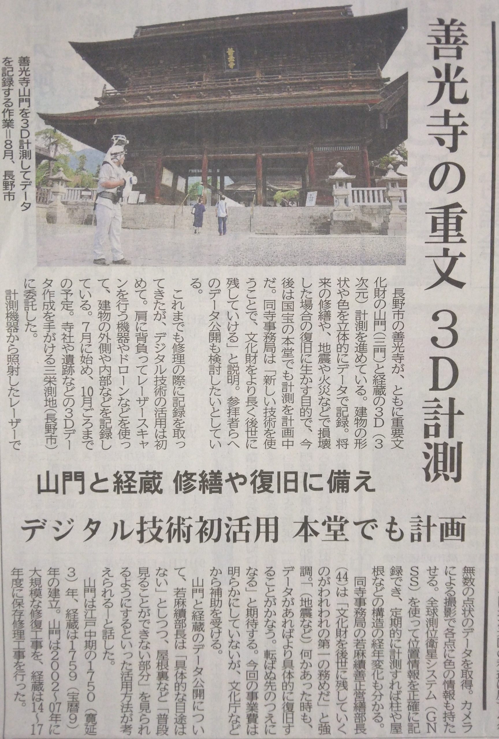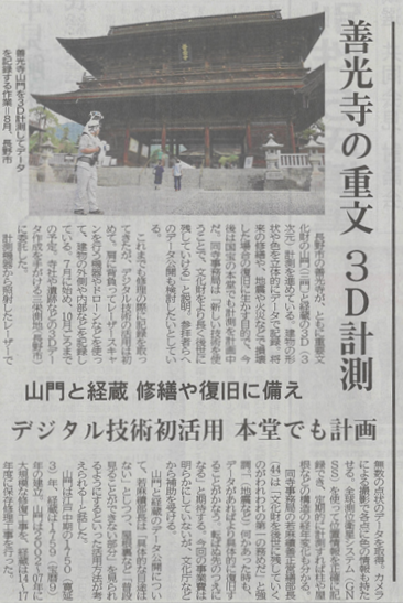 長野市の善光寺にて実施した、3Dスキャナーを使用して建造物の立体的なデータを記録する3D計測についての記事が新聞に掲載されました。