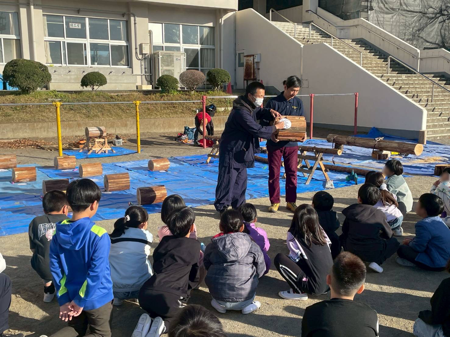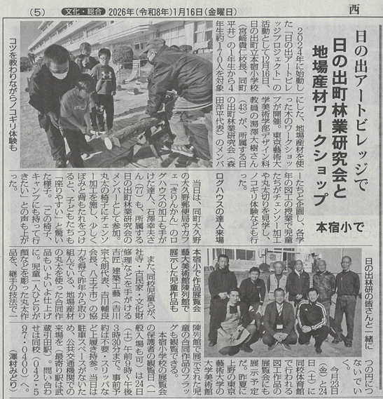 昨年12月16日に〈日の出アートビレッジプロジェクト【プロジェクト:東京山藝術大学 学長 湯澤 大樹 様】〉 の活動の一環として、本宿小学校の1年生から4年生の約170人の子ども達と、地域の自然素材である丸太を活用した作品作りを行いました。