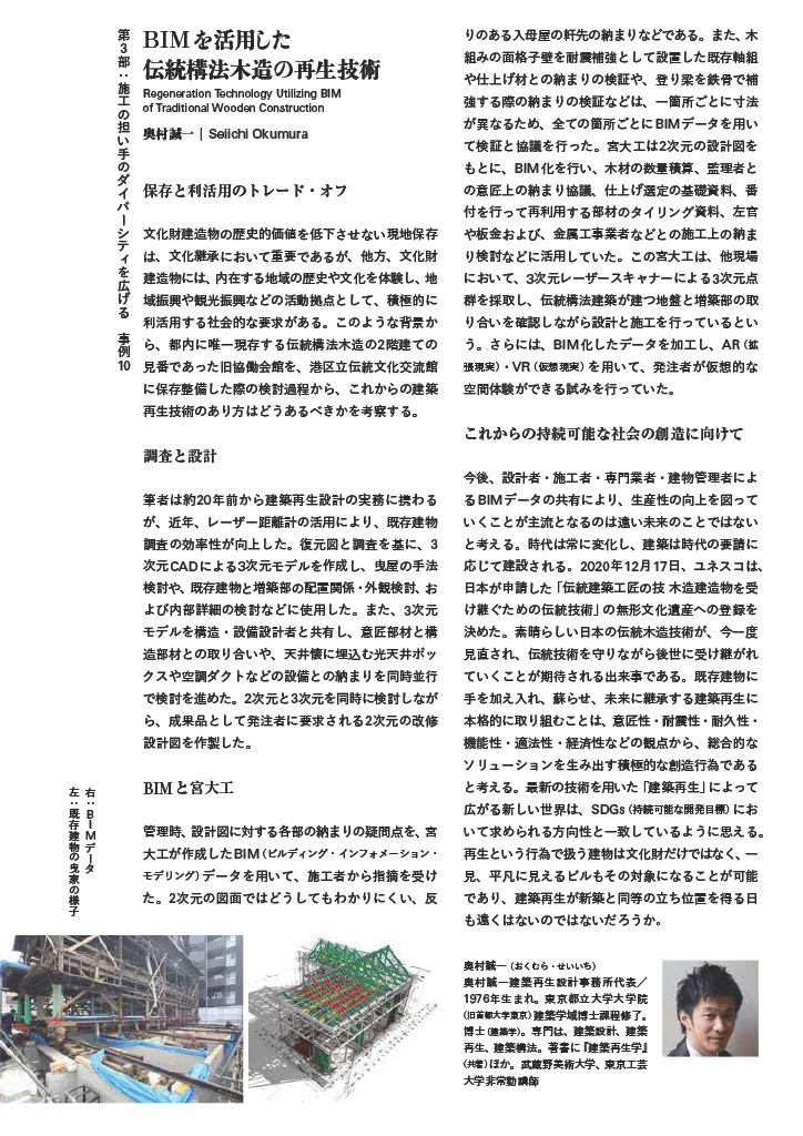 今回の記事は、都内に唯一現存する伝統構法木造の2階建ての見番であった旧協働会館を港区立伝統文化交流館に保存整備した事例を軸に、奥村氏がこれからの建築再生技術のあり方について考察された内容となっております。