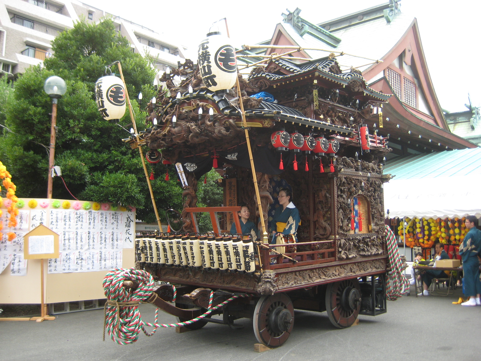 元横山町山車は、その独特な八棟造りの複雑な屋根と、豪華な彫刻が相まって、とても華やかな仕上がりの山車となっています。