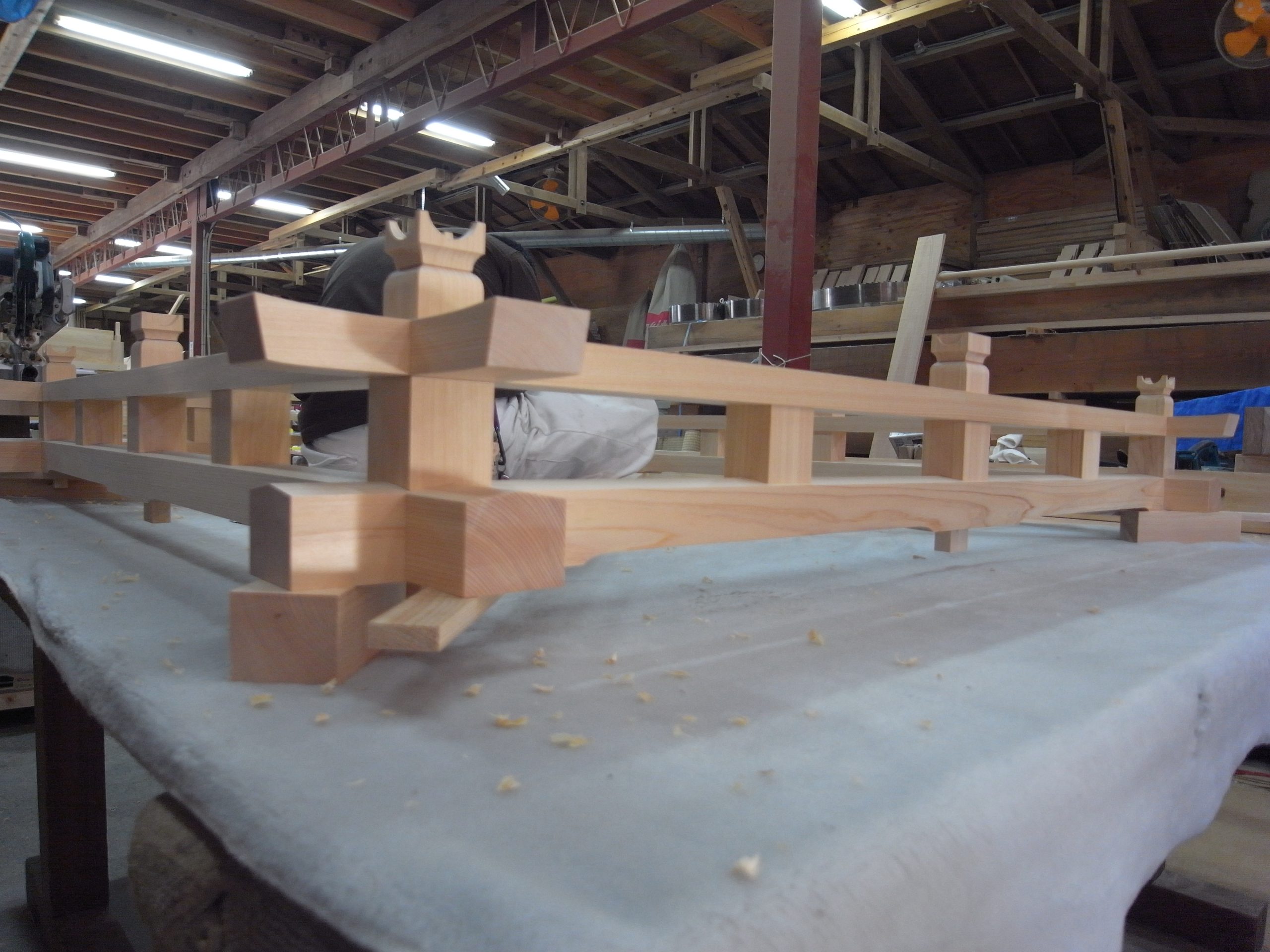 工事の中盤では、八王子の本社で加工した部材を組み立て、大型トラックに積載して出雲大社の境内まで運搬し、慎重に設置作業を行いました。